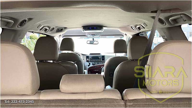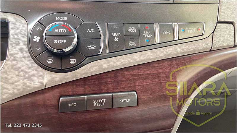Llaves de presencia con botón de encendido. Asiento del conductor eléctrico. Volante multifunciones forrado en piel con ajuste de altura y profundidad, control de crucero, controles de audio, controles para teléfono, etc. Acabados de madera. Climatizador automático de múltiples zonas. Pantalla que muestra cámara de reversa y detalles multimedia, etc. Sistema de sonido de excelente calidad de agencia, con Bluetooth, entrada auxiliar, lector de CD, DVD con pantalla frente a los asientos de pasajeros, múltiples bocinas en todas las puertas y demás lados. Amplios asientos traseros, con descansabrazos. Amplia cajuela y, además, los respaldos traseros son abatibles, por lo que se puede tener una cajuela aún mayor en caso de ser necesario. Las puertas laterales y cajuela tienen apertura eléctrica.